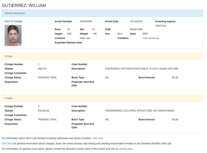 Según el informe difundido, la detención de Levy se registró en la ciudad de Weston en una acción en la que intervinieron agentes de la Oficina del Sheriff de Broward. Testigos alegan que el hombre de 44 años se resistió al arresto, por lo que fue esposado por los agentes de seguridad para ser trasladado.