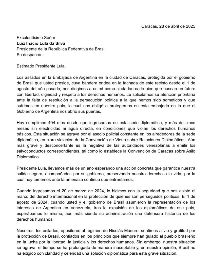 En la misiva hecha pública, piden al gobierno de Brasil, como un imperativo, acompañarlos en su salida a otro destino seguro fuera de Venezuela, dado que ese país asumió la responsabilidad de custodiar la sede diplomática en Caracas desde agosto de 2024, tras la expulsión de la delegación Argentina.