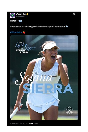 La mismísima cuenta oficial del Grand Slam que se disputa en la Catedral del tenis reconoció lo hecho hasta el momento por la marplatense. “Histórico. Solana Sierra está construyendo El Campeonato de sus sueños”, reconocieron desde la organización del Major.
