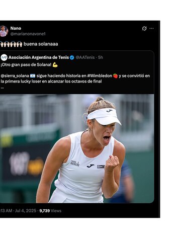 Uno de los primeros en reaccionar al triunfo de la marplatense fue el capitán de Copa Davis, Javier Frana. “Felicitaciones Sol! No era broma cuando te decía “Wimbledon 2027”... te adelantaste!!“, publicó el exnúmero 30 del mundo y finalista en el Major inglés en dobles en 1991 en su cuenta de X. En los últimos años, Solana llamó la atención de todos los expertos del deporte blanco y el entrenador del equipo nacional no fue la excepción.
