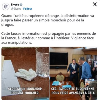 “Cuando la unidad europea se interpone en el camino, la desinformación llega al extremo de hacer pasar un simple pañuelo por droga. Esta falsa información la difunden los enemigos de Francia, tanto dentro como fuera del país. Cuidado con la manipulación”, advierte Francia.