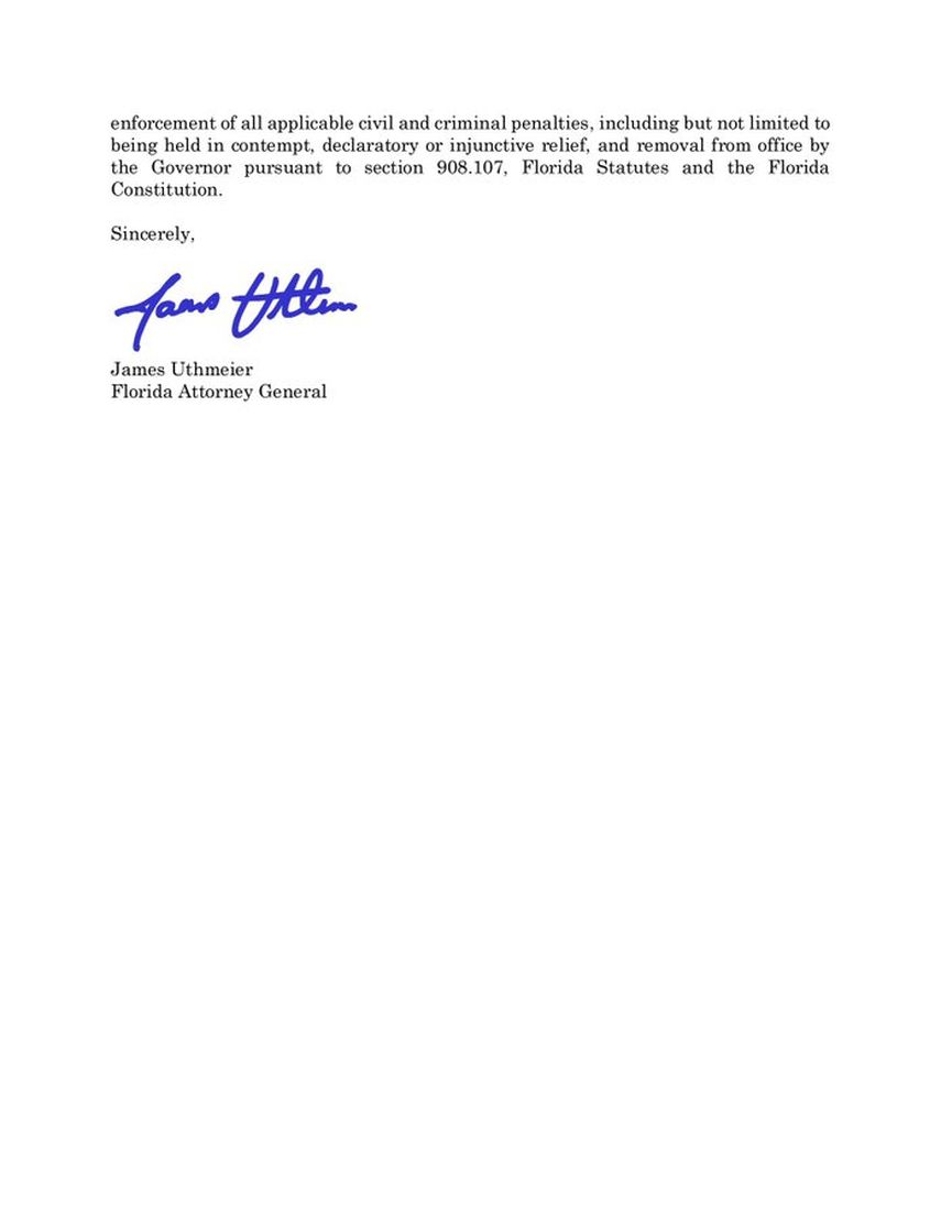 En su carta, Uthmeier declaró que "las políticas santuario no son toleradas ni legales en Florida" y advirtió que la negativa a colaborar podría resultar en la destitución de los funcionarios implicados. Asimismo, mencionó posibles sanciones civiles y penales.