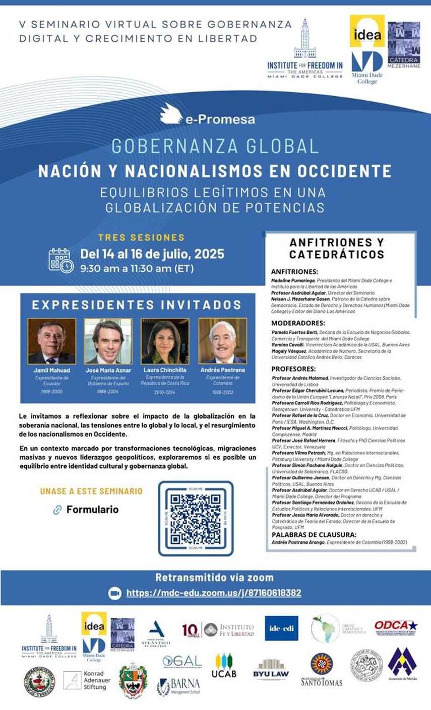 El evento en línea, en el que participarán los expresidentes Jamil Mahuad, de Ecuador (1998-2000); José María Aznar, de España (1996-2004); Laura Chinchilla, de Costa Rica (2010-2014); y Andrés Pastrana, de Colombia (1998-2002), junto a 12 prestigiosos catedráticos, se llevará a cabo del 14 al 16 de julio, de 9:30 am a 11:30 am (ET).
