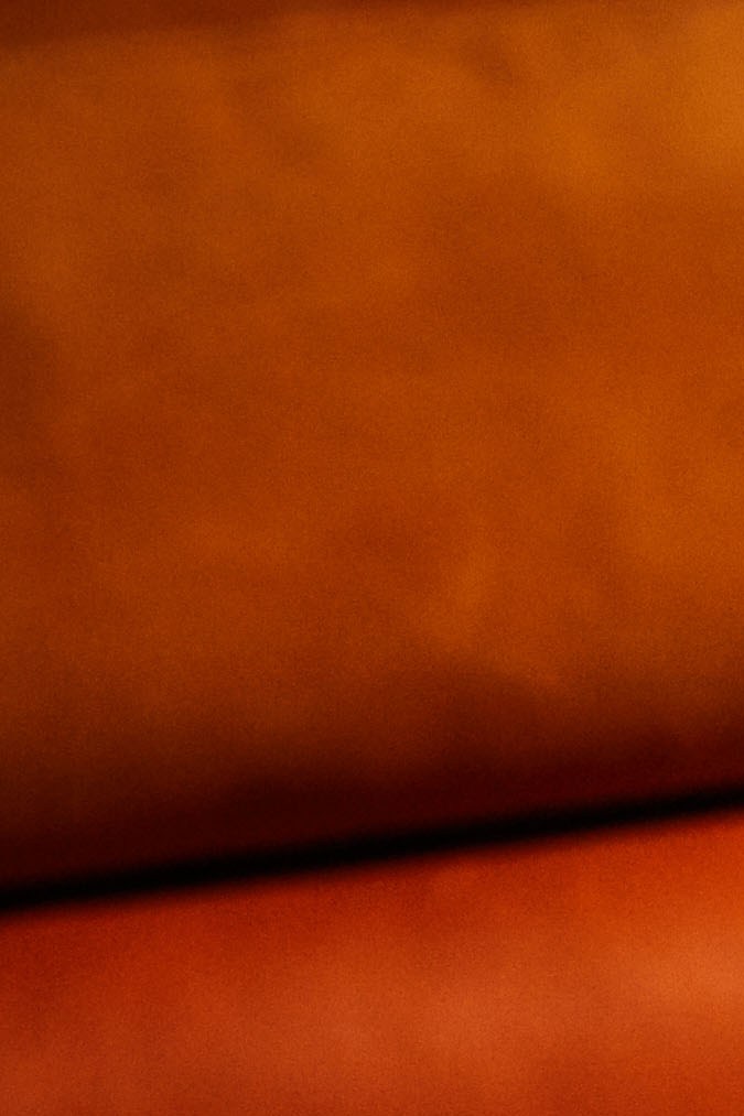 Los tonos naranja, durazno, ámbar y violeta, junto con texturas mixtas y patrones diversos en pisos y muros, crea una atmósfera muy acogedora. En el comedor principal, cortinas translúcidas teñidas con pigmentos naturales cubren las ventanas y bañan el espacio con una luz cálida color naranja. Ese resplandor se refleja en los grandes candelabros que cuelgan del techo y contrasta con el suelo de mármol, decorado con un elegante patrón geométrico de trapecios y cuadrados.