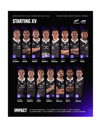 Los Pumas y los All Blacks se verán las caras este sábado 16 de agosto, desde las 18.10, en el estadio Mario Alberto Kempes (Córdoba). El árbitro principal será el francés Pierre Brousst, mientras que sus asistentes serán Nic Berry y Morné Ferreira. El encargado del TMO será Marius van der Westhuizen y el FPRO estará Damon Murphy