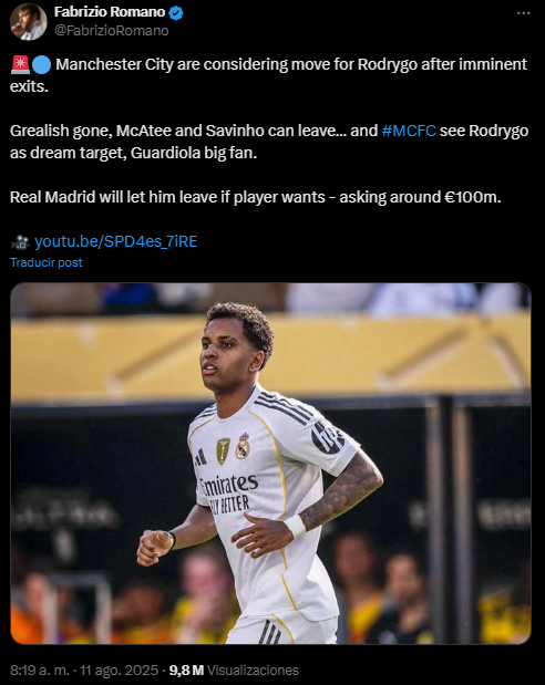 El Manchester City podría mover ficha en el mercado si se concretan dos operaciones clave: la cesión de Jack Grealish al Everton y el traspaso de Savinho al Tottenham. En este escenario, Fabrizio Romano ha revelado que “el Manchester City está considerando fichar a Rodrygo”.