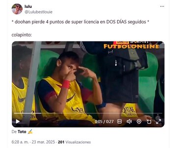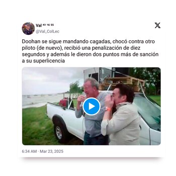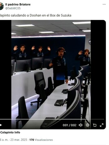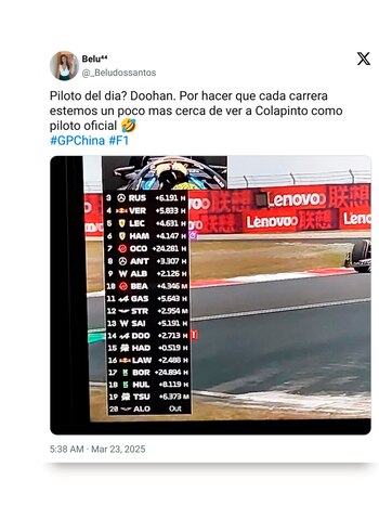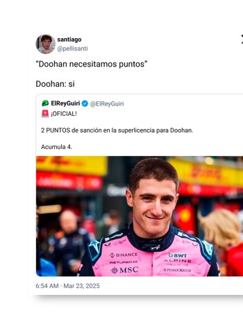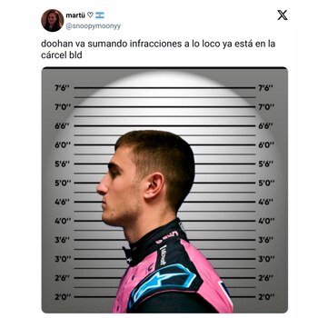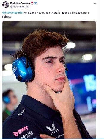 Como suele suceder en estos casos, los fanáticos de Franco Colapinto también hicieron su aparición para hablar del nuevo incidente del rival interno del oriundo de Pilar. “Analizando cuánto le queda a Doohan para subirme”, citó un fanático en las redes, que acompañó el texto con una foto del argentino y una mirada pensante.