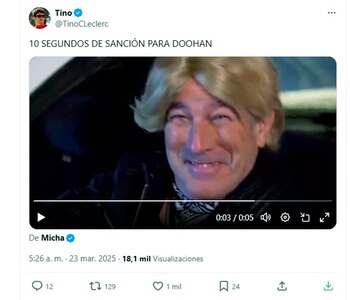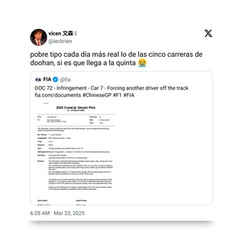 Es que la jornada del sábado dejó como saldo una sanción doble para Doohan: recibió 10 segundos de recargo en la clasificación de la carrera sprint (culminó último) y el retiro de dos puntos en su superlicencia tras un incidente con el piloto brasileño de Sauber Gabriel Bortoleto. Este domingo, luego de clasificar en el puesto 18 para la carrera principal, el hijo de un histórico campeón de motociclismo volvió a ser penalizado por su accionar en pista.