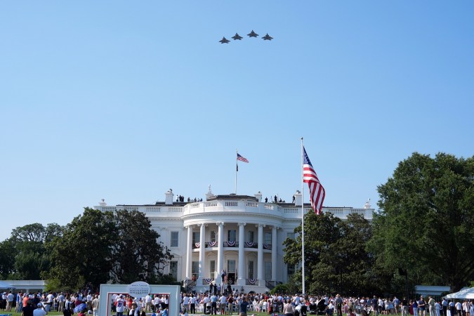 Aviones militares sobrevuelan la Casa Blanca durante la celebración del 4 de Julio. Foto: Evan Vucci / APAl acto asistieron unos 150 aviadores de la Base Aérea Whiteman, en Misuri, a quienes el mandatario agradeció su labor.