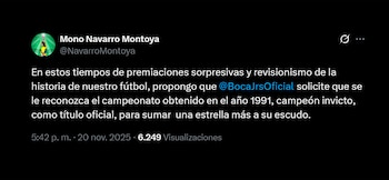 Carlos Fernando Navarro Montoya, arquero y figura de aquel Boca que arrasó en el Clausura 91 y después perdió la final de la temporada contra el Newell’s de Marcelo Bielsa, expresó en X (ex Twitter): “En estos tiempos de premiaciones sorpresivas y revisionismo de la historia de nuestro fútbol, propongo que Boca Juniors solicite que se le reconozca el campeonato obtenido en el año 1991, campeón invicto, como título oficial, para sumar una estrella más a su escudo”.