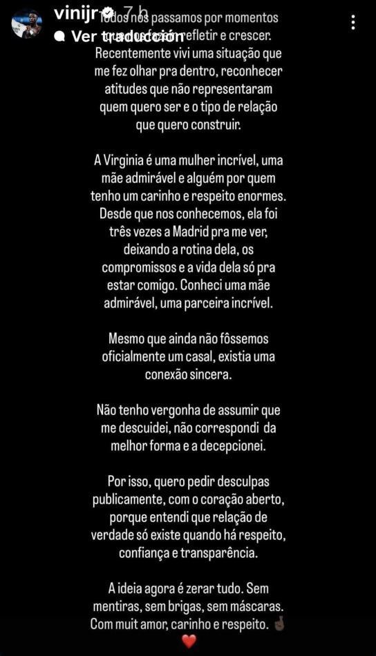Ante el revuelo que ha provocado el asunto en Brasil, Vinícius publicó en redes un comunicado pidiendo disculpas a Virginia Fonseca y asegurando que “aunque todavía no éramos oficialmente una pareja, había una conexión sincera”.