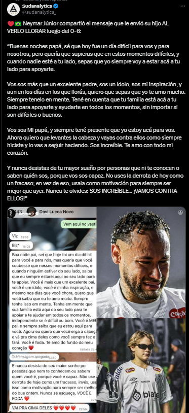 Sin embargo, en medio de la tristeza, llegó un momento de consuelo. Neymar compartió en redes sociales el mensaje de su hijo Lucca, de apenas 13 años, quien le recordó que nunca estará solo.